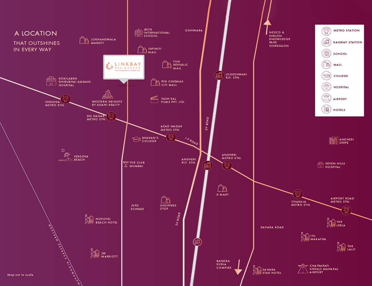 Adani Linkbay Residences in Andheri West, Mumbai, is a 2.5-acre integrated development featuring six 26-storey towers offering spacious 2, 3, and 4 BHK apartments. Residents can enjoy over 50 lifestyle amenities, including a rooftop infinity pool, sky lounge, and sports arena. The project also boasts a 45,000 sq. ft. clubhouse and 35,000 sq. ft. of retail space, providing a blend of luxury living and convenience. Strategically located, it offers easy access to high-street retail outlets, top hospitals, international schools, and metro stations within a 10-minute radius.